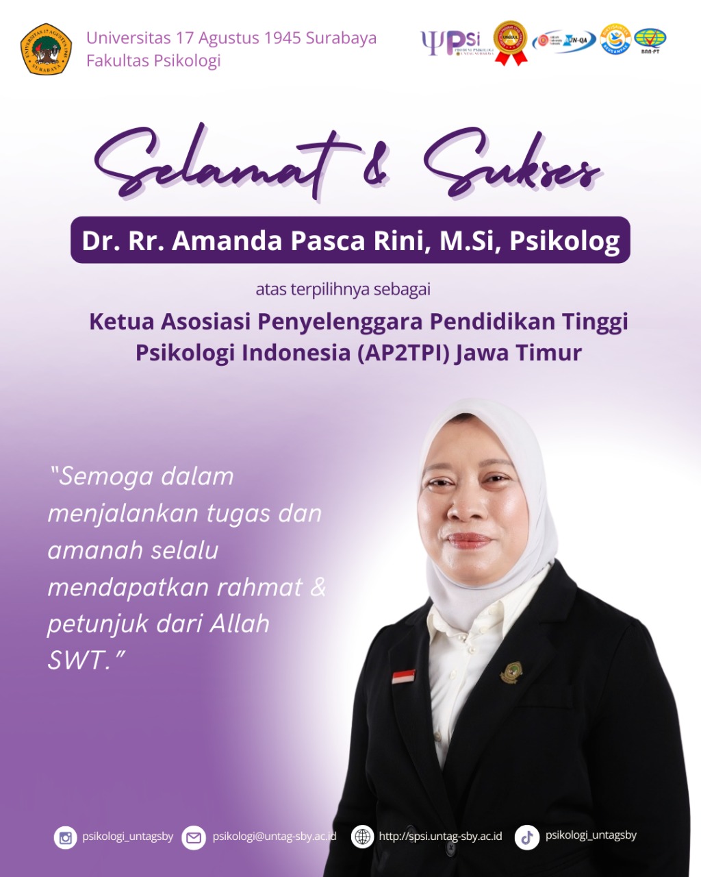 Selamat dan Sukses atas terpilihnya Dr. Rr. Amanda Pasca Rini, M.Si., Psikolog...