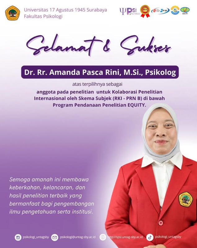 selamat dan sukses kepada Dr. Rr. Amanda Pasca Rini, M.Si,Psikolog atas terpilihnya sebagai anggota peneliti dalam Kolaborasi Penelitian Internasiona